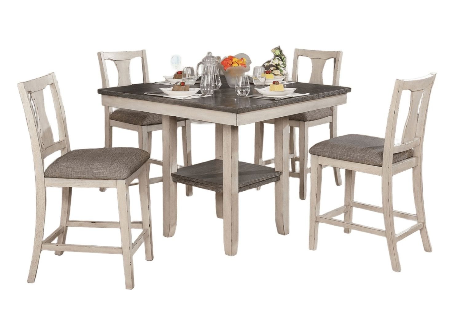 Product DescriptionProduct Description:-Country style goes perfectly with feeding a big gathering of friends and family. This seven piece set includes a large dining table and six chairs, giving you the perfect solution to your dining room. The soothing toned down antique white wood and gray fabric color combination gives you a relaxed place to enjoy your meals and chats. Comfort and style all in a compact collection. Product Dimensions:-Dining Table - 40"L X 40"W X 36"HDining Chair - 18 1/4"W X 22 1/2"D X 41 1/4"HListing Includes :- 5pc Counter Height Dining Set (1x Counter Height Dining Table And 4x Chairs) Only.Simple assembly required.Product Features:-RusticAntique White, GrayLeatherette, Solid Wood, Wood Veneer, OthersPlank DesignOpen Bottom ShelfTapered LegsPadded Cushions